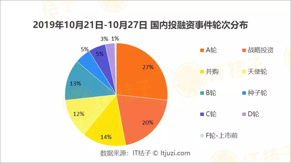 从轮次分布来看,上周 A 轮事件占比较大,发生 54 起,占比 27%;战略投资排名第二,发生 41 起,占比 20%;并购事件位列第三,发生 28 起,占比约 14%。
