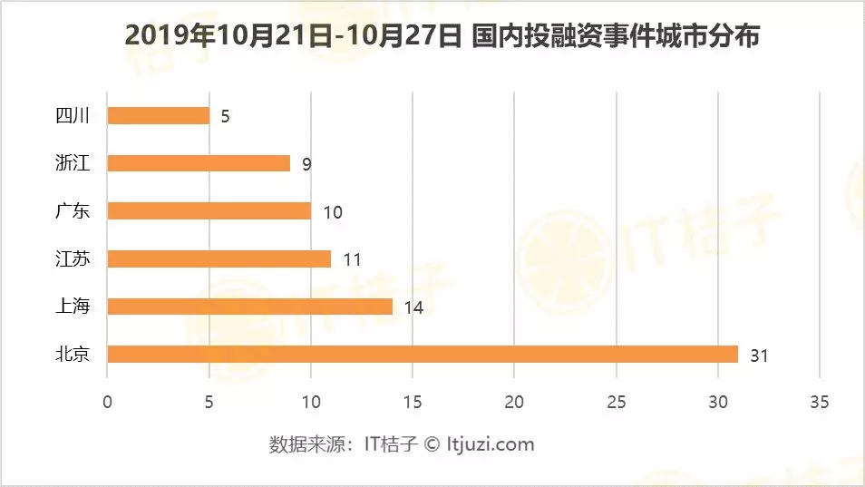 从区域分布来看(本周新增),和IT桔子预测的一样,北京依然是当之无愧的“投融资高地",发生 31 起,按照一周7天来计算,平均每天达成 4.4 笔融资并购交易;上海位居第二,发生 14 起;江苏险胜广东居第三,发生 11起。