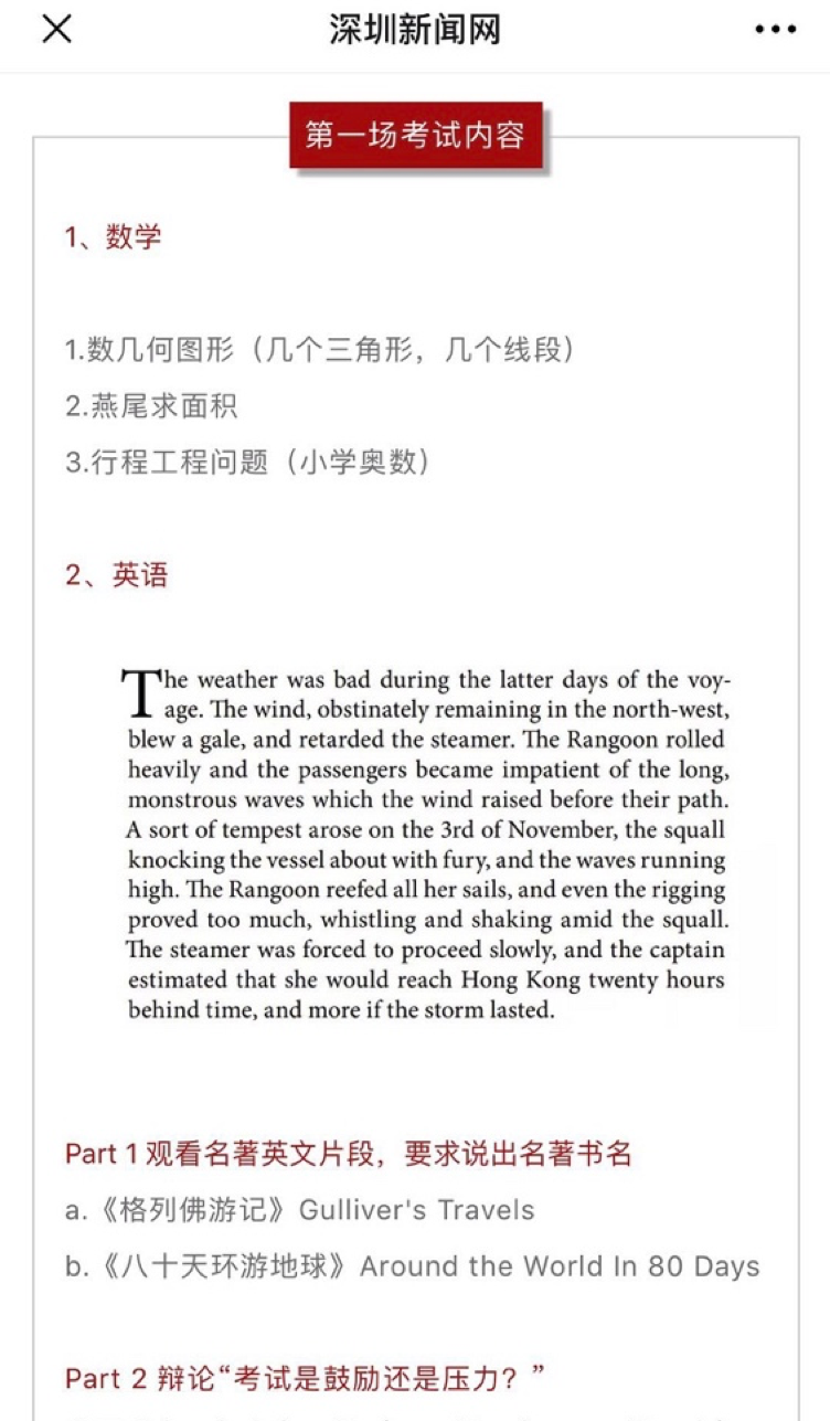 所谓的“体验活动”于5月11日和12日举行,共六场,其实质为语数英考试。在深圳新闻网公布的试题中,有如“介绍马化腾的经历并对他做出评价”的语文题、排列组合的数学题,以及以ness为韵脚填写诗词的英语题。试题公布后,部分网友表示难度颇高。