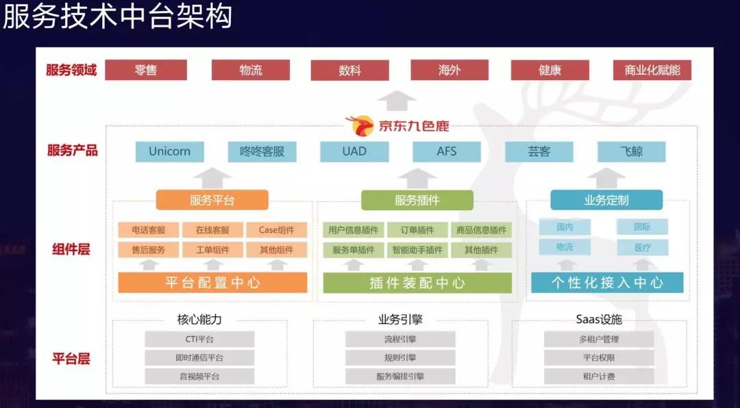 服务产品层:在前两层之上,我们的产品体系最终得以构建,包括客服服务平台、电话呼叫中心服务平台、售后服务平台等,在这一层对接、服务京东所有的业务领域。