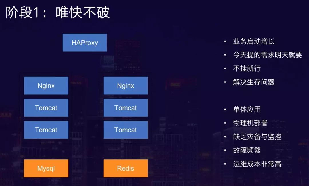 就架构发展历程来讲,京东第一阶段的应用结构都是单体应用,例如在物理机上部署一个 Nginx+Tomcat,要求非常简单,就是快。那么多时间做复杂的设计,简单粗暴,一堆代码放上去能跑就可以了。当然,这种设计的缺点也非常明显,就是运维成本非常高,没有什么灾备部署,服务器挂了就是挂了。
