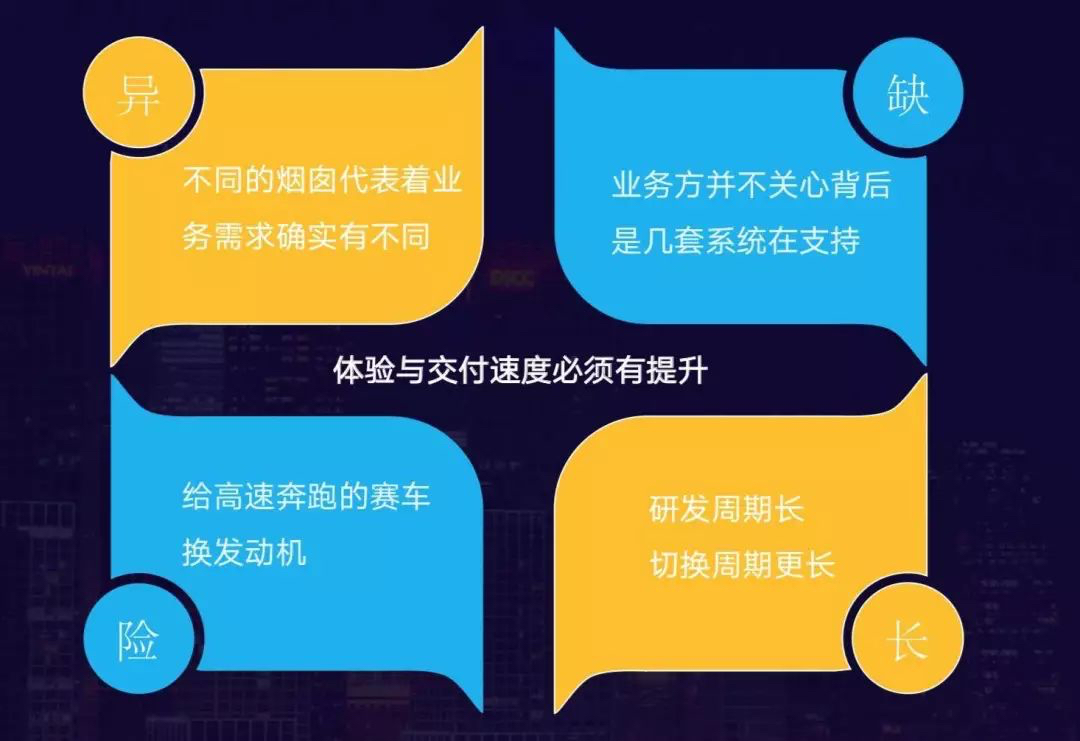 我称这种整合为一种艺术,为什么?第一,不同的“烟囱”确实代表业务需求不一样,如果需求一致,不可能出现几个烟囱;第二,业务方并不关心底层有几套系统在做支撑,他们关注的是体验和交付有没有得到提升,但我们要得到业务方的支持。因为中台建设其实需要投入大量的资源和人力,在这个过程中,一定程度上会减少支撑业务的技术人员数量,所以要和业务方提前达成一致。这就像要为高速奔驰的赛车更换发动机,简单的系统一两周就迁移完了,复杂的系统可能要半年、一年才能迁移完成。
