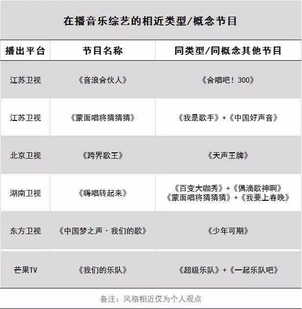 另外,像《音浪合伙人》与《合唱吧!300》相似,都是以合唱作为主打元素;《我们的乐队》和《超级乐队》《一起乐队吧》相似,都是以选秀成乐队为主要内容。
