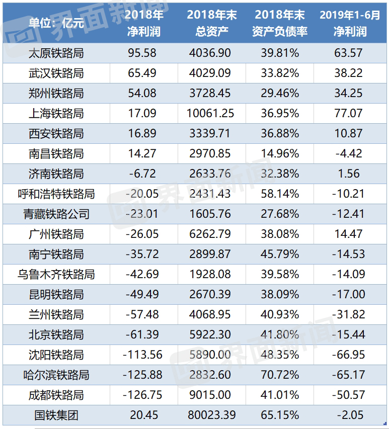 除了上述六家铁路局,其他铁路局都处于亏损状态,亏损额多在50亿以下;成都、哈尔滨、沈阳三地的铁路局亏损超过百亿。