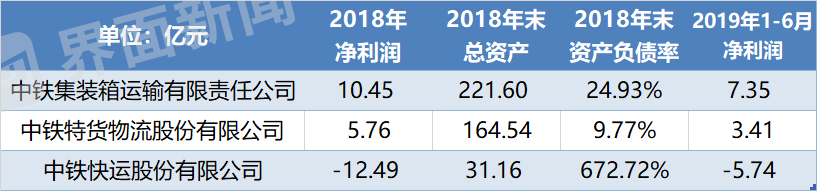 只有中铁快运仍旧处于亏损状态,去年亏损12.49亿元,同时其净资产为-178.46亿,导致其资产负债率极高。界面新闻记者曾获悉,中铁快运2019年的经营目标是亏损控制在2亿左右,2020年按计划应实现扭亏为盈。但其上半年已经亏损了将近6亿。