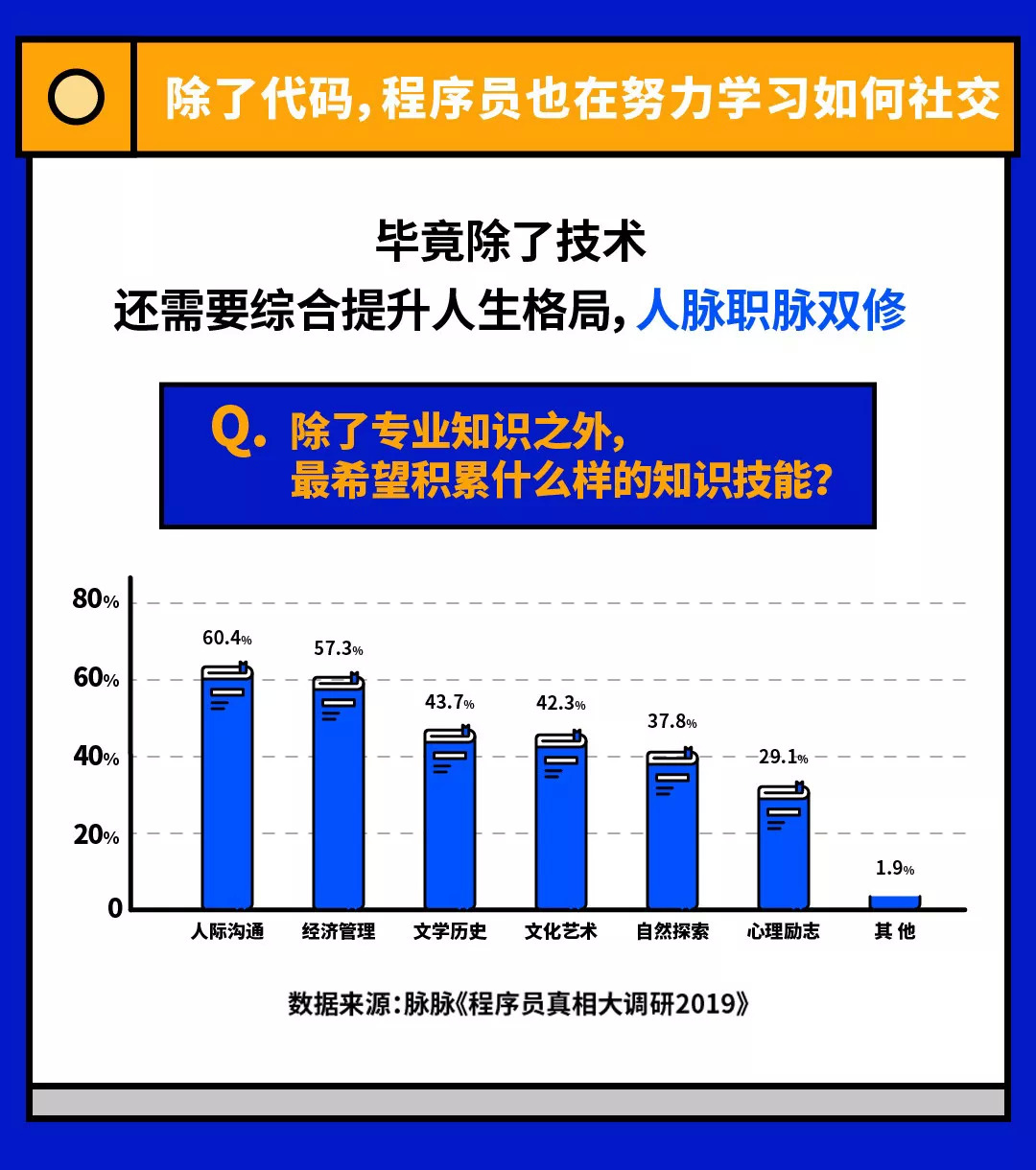根据脉脉《程序员真相大调查2019》的调研数据,在专业技术之外,程序员最想学习的是人际沟通和经济管理知识。