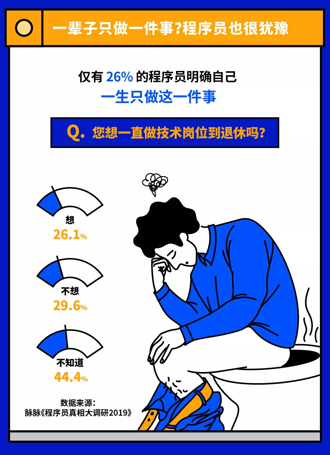 脉脉《程序员真相大调研2019》的数据也印证了李鹏举的说法,只有26.1%的受访程序员表示,愿意一直做技术岗位到退休。