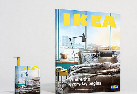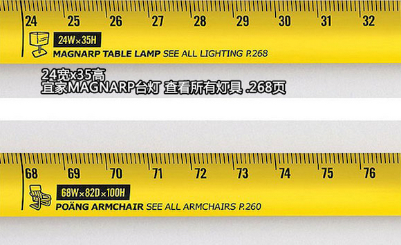 同一年,宜家还在部分地区为产品目录搭配了一把目录外形的弹簧尺。尺的刻度上则标注了部分产品的数据,并贴心地写上了该产品的目录页码。这一举动,应该就是为了消费者感觉到“关怀一直在身边”吧。