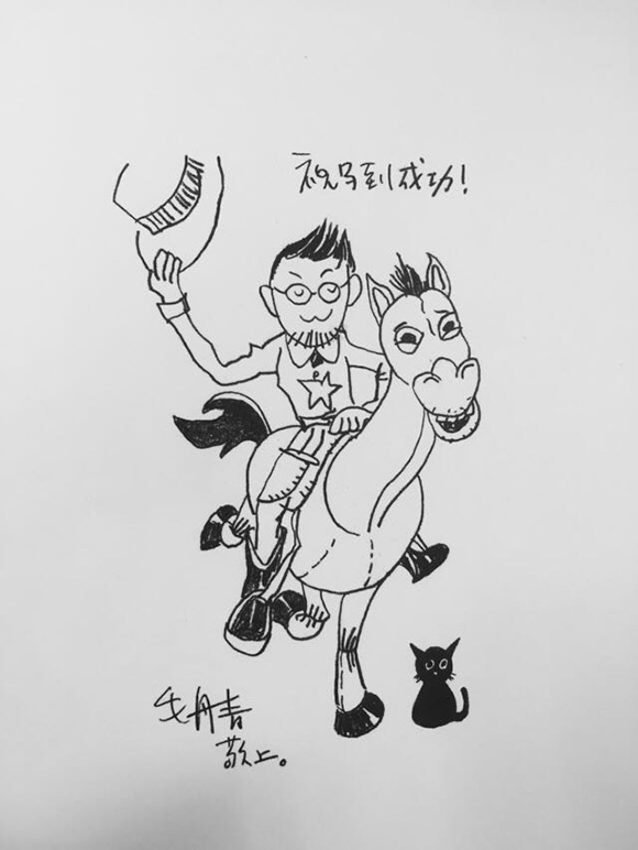 毛丹青本人其实也可以用“萌”来形容,从在他夸赞自己学生时亮起来的表情,到他在笔记本中的一些可爱的手绘,以及手绘时圆圆的字体,都看得出毛丹青本人的心态十分年轻,他是了解年轻人的,这或许也是促成他成为《知日》杂志主笔的原因之一。