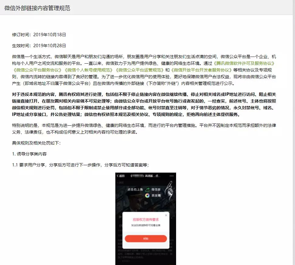 根据微信发布的《微信外部链接内容管理标准》,微信外链“不可进行好友助力、加速、砍价、任务收集等违规活动”、“不可以违规拼团等”。