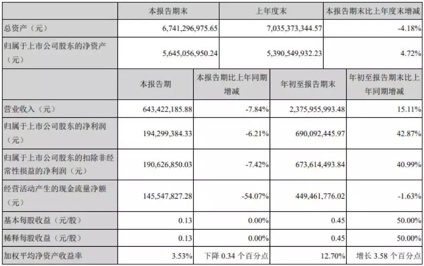 其中,第三季度营收6.43亿元,同比下降7.84%;归母净利润1.94亿元,同比下降6.21%。