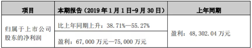 根据此前的业绩预告,公司预计2019年1月-9月归母净利润为6.7亿元-7.5亿元,与上年同期相比增长38.71%-55.27%。对比业绩预告,公司前三季度归母净利润6.9亿元,靠近业绩预告区间下限。