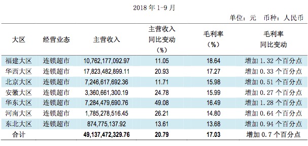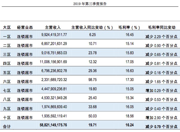 从六区变十大区的过程,福建大区的范围没有改变,但对比2018年永辉三季度和2019年三季度的福建大区,营收增速分别为11.05%和6.25%,且各大区的毛利率有了不同程度的下滑。