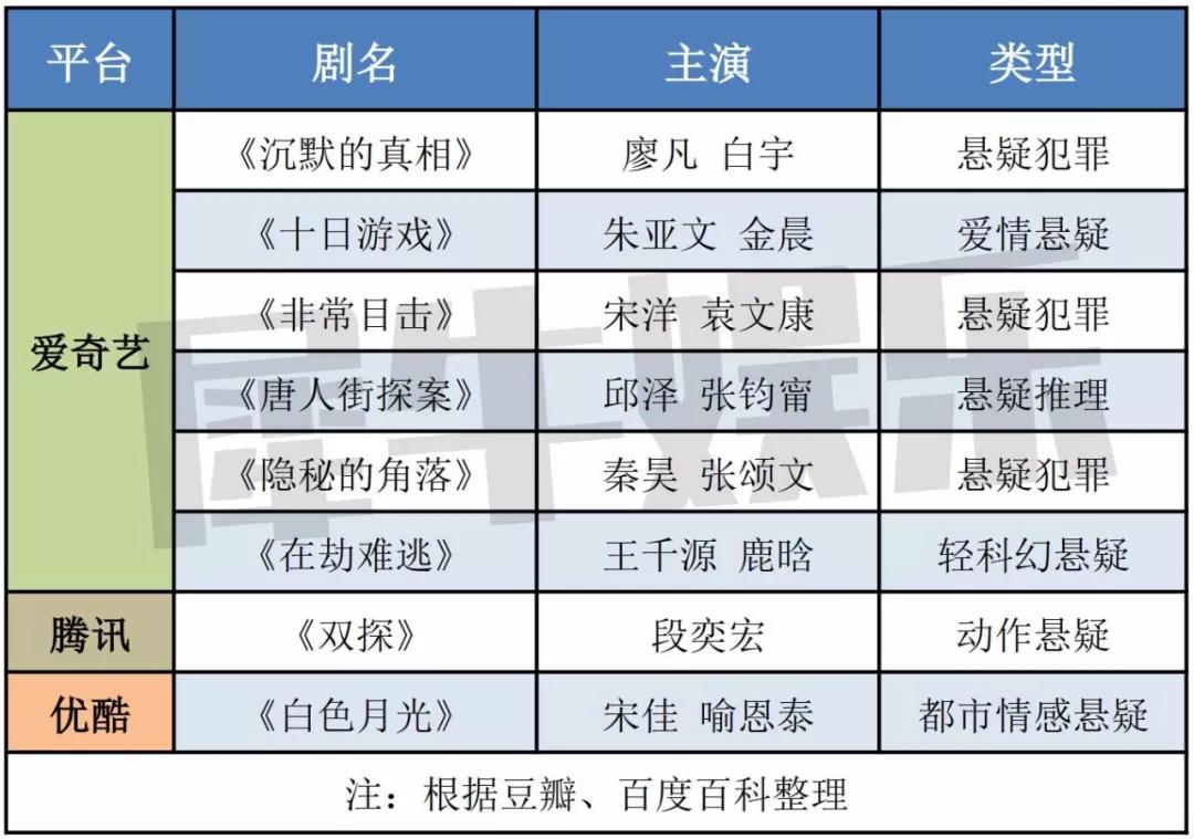 腾讯视频的《双探》由段奕宏监制并主演,余下演员阵容还未公布,预计在本月底开机;优酷的《白色月光》已于9月末开机,从剧集简介和发布的概念特辑看,《白色月光》属女性向悬疑剧,故事切入视角在一对“问题夫妻”的婚姻。