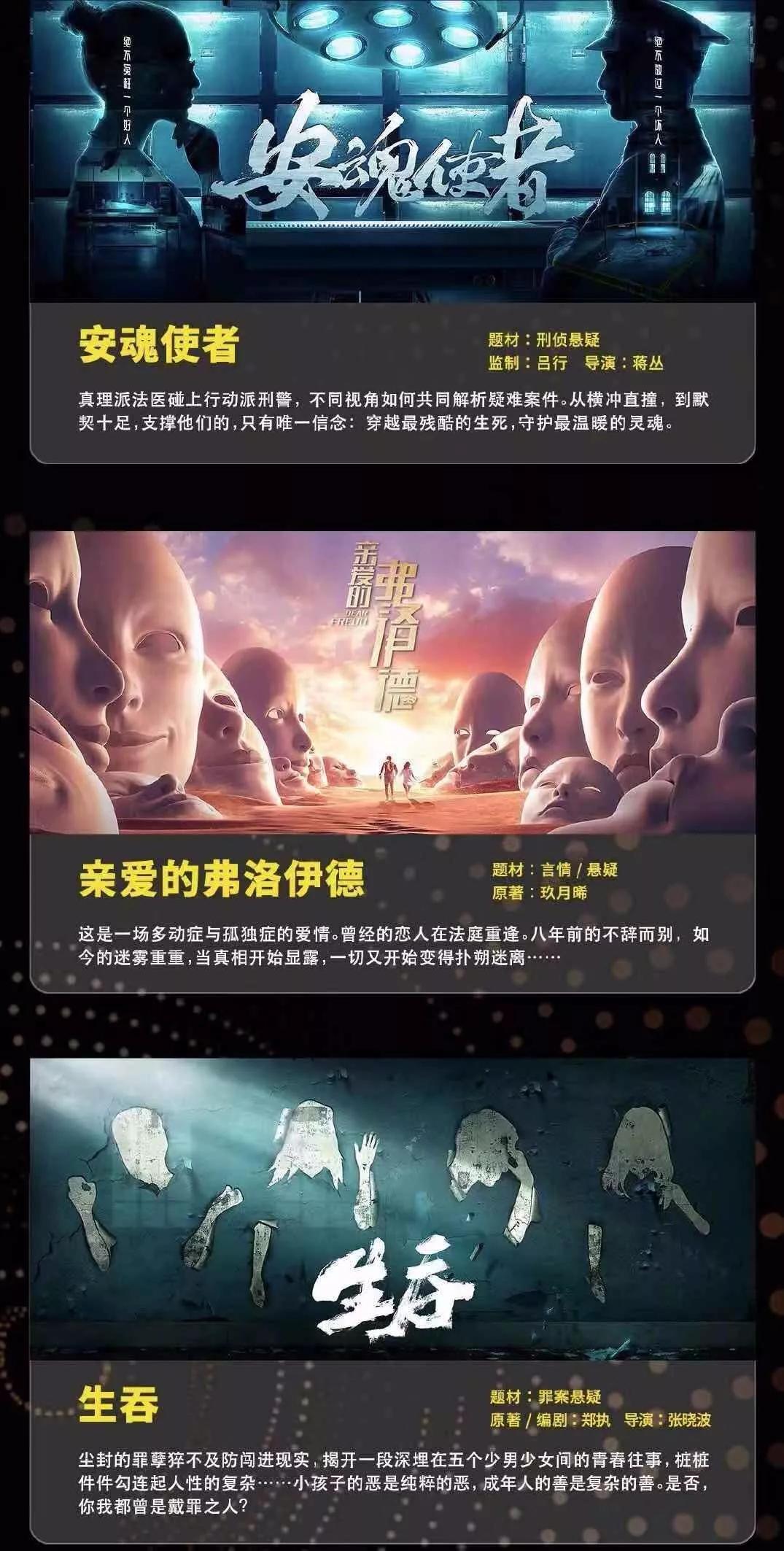 值得一提的是,早在2019上海电视界开幕时,柠萌影业也一口气发布了《安魂使者》《亲爱的弗洛伊德》《生吞》三部不同类型的悬疑题材短剧集,且不出意外,这三部剧集同样都会在明年播出。
