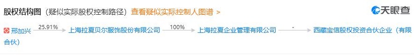 其中,投资额较大的两个项目却是两个股权投资公司:天津星旷企业管理咨询合伙企业(下称天津星旷)和西藏宝信股权投资合伙企业(下称西藏宝信)。账面价值分别为2.36亿元和1.57亿元。今年上半年,拉夏贝尔已经以2.75亿元,出售天津星旷98%的股权。获得微利0.29亿元。根据天眼查信息,天津星旷和西藏宝信都是股权投资基金。其中,西藏宝信疑似由拉夏贝尔实控人邢加兴控股。