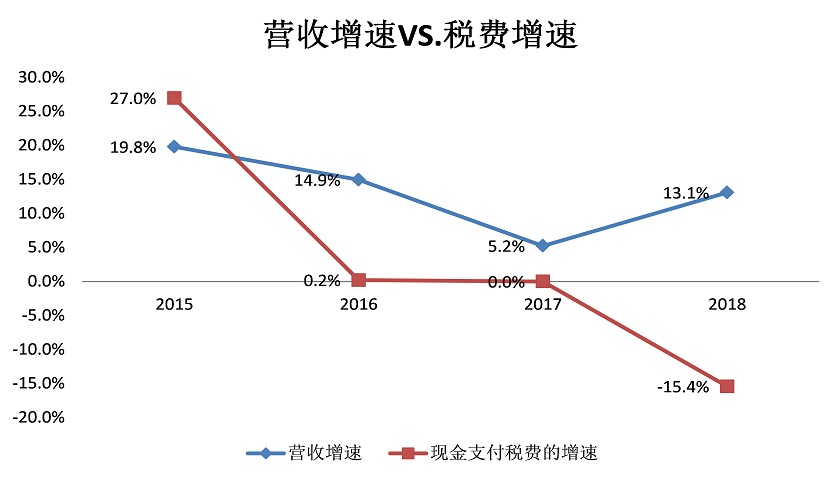 巧合的是,也就是从2016年开始,拉夏贝尔支付各项税费的现金支出就开始停止增长,其中增值税占大多数。一般而言,增值税是按照营业收入的一定比例征收。而且,拉夏贝尔经营性现金流从2015年开始逐年下滑。同期,公司营业收入却一直处于增长状态。各项税费支出现金占营业收入的比例也从2015年的13.2%下降到2018年的8.2%。营业税金及附加项目也出现了同样情况,占营业收入比例从2015年的1.22%下降到了2018年的0.77%。各项税费和营收的增速不匹配又加深了拉夏贝尔虚增营业收入的嫌疑。