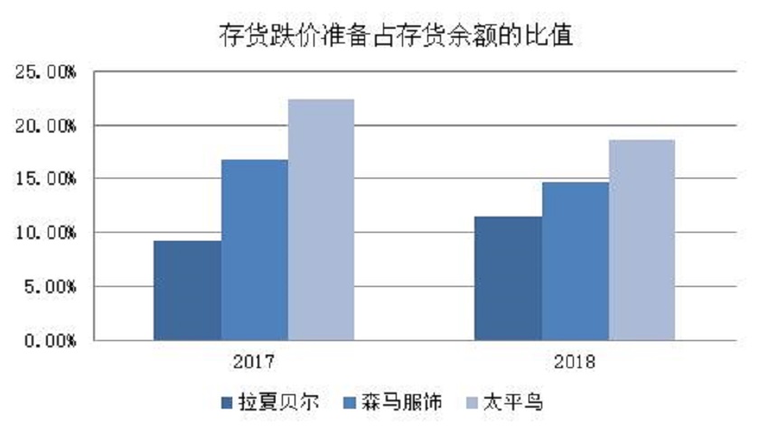 挤压存货之后,存货跌价往往是随之而来的风险。2018年和2017年,拉夏贝尔存货跌价准备与存货账面余额的比值分别为11.5%和9.2%。森马服饰2018年、2017年该比例分别为14.7%和16.8%。太平鸟2018年、2017年该比例分别为18.6%和22.4%。相比同行,拉夏贝尔存货周转效率更低,而提取的跌价准备却远低于同业水平,说明拉夏贝尔提取的存货跌价准备不足。过往年度利润存在虚高的现象。