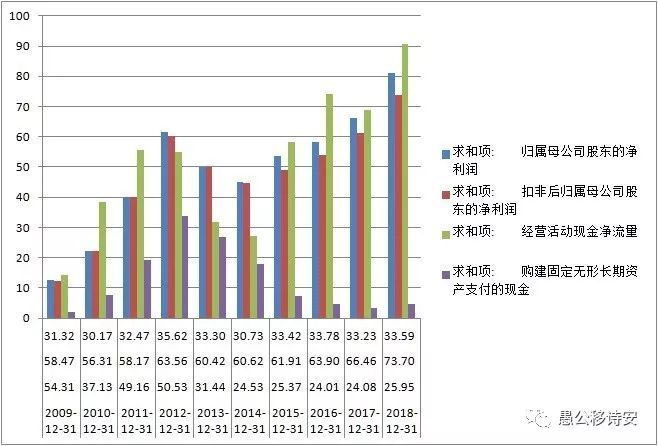 其中洋河股份,一直是白酒龙头之一。2009年-2018年,洋河股份净利润合计490亿元,经营现金流合计514亿元,占净利润104%;自由现金流合计386亿元,占净利润78%。十年ROE平均值高达28%,毛利率达到62%。库存具有越放越陈的特性,常年没有应收账款,高毛利腾挪空间大。