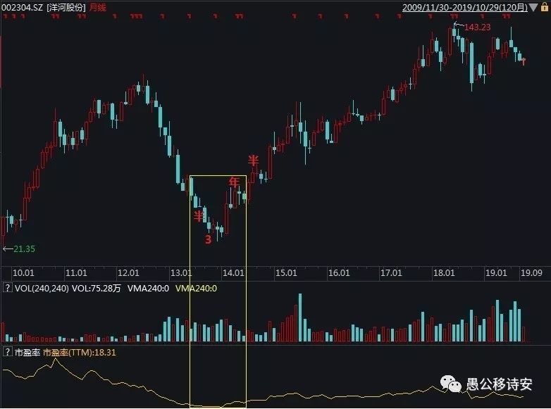 在整个黄色方框内,是洋河上一轮业绩调整所经历的走势,我们发现如果你照着单季度报表数据进行追涨杀跌的话,那么你将精准地在最低点割肉,同时那也是PE的低点。市场总是预先调整,在最坏的财报公布之前,就走完了探底和回升的过程。