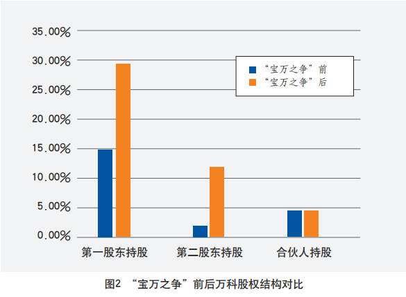 截至2015年1月27日,合伙人累计持股已达到公司总股本的4.48%,成为当时万科A股中仅次于华润的第二大股东。万科2014年年报显示,万科股权结构原本高度分散,其中第一股东占总股本比例14.9%左右,第二股东占总股本比例长期低于2%,高度分散的股权结构使得管理层能够通过合伙人持股计划增强对公司的控制力。