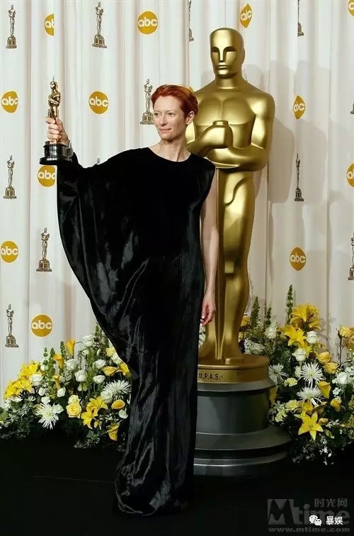 和巩俐不同的是,蒂尔达·斯文顿并没有前凸后翘的女性化身材,而是扁平、清瘦。
