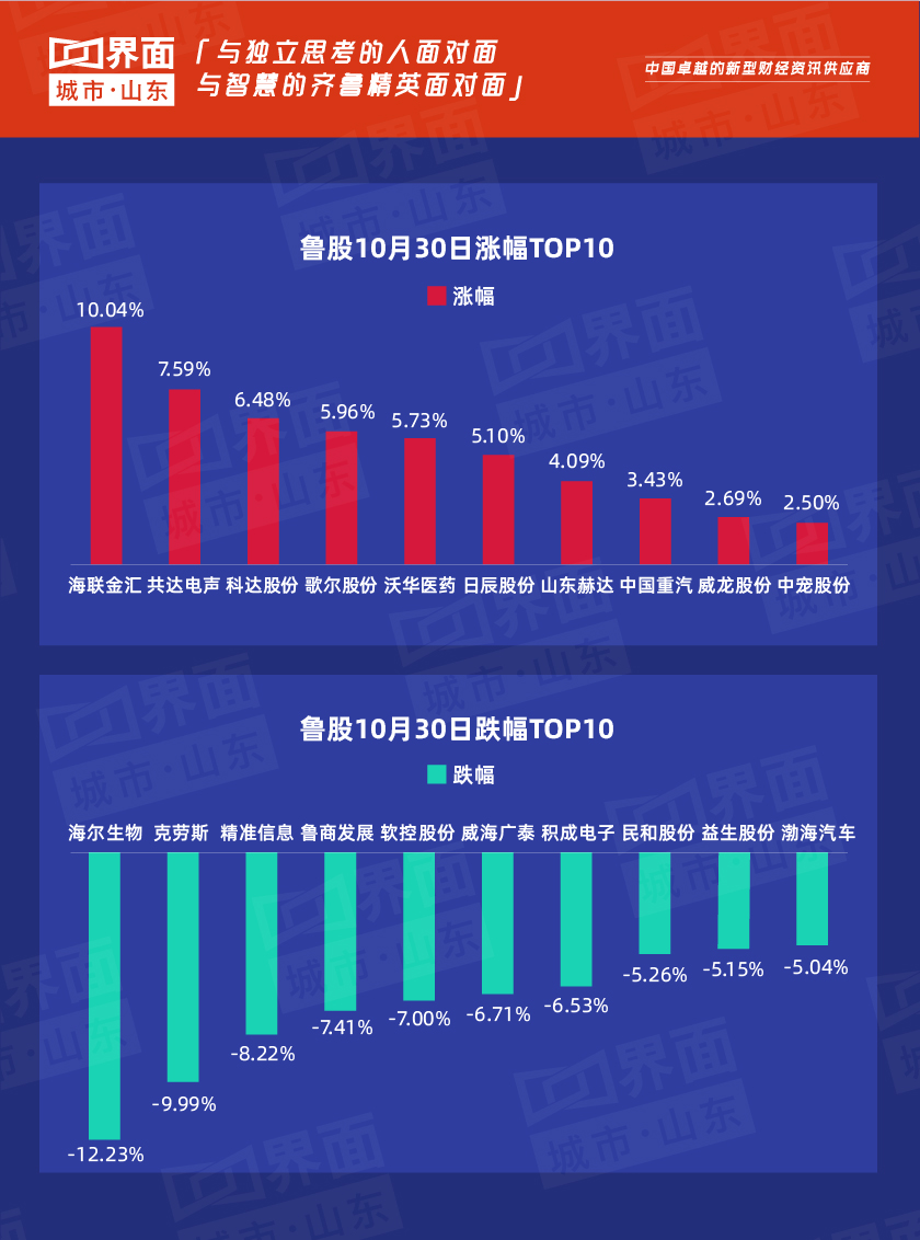 10月30日,山东省内沪深股票有53只个股上涨,150只下跌,1只与上一个交易日收盘价持平;