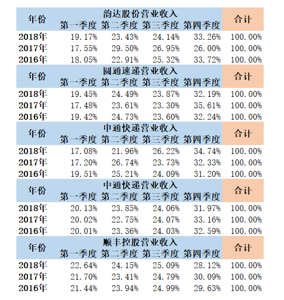 进入第四季度,网络购物集中促销,特别是“双十一”、“双十二”等电商节庆,在极大刺激了消费者购物需求的同时,也使得对快递的需求集中释放。据国家统计局数据显示,2018年双十一期间,全国邮政、快递企业共处理邮(快)件18.82亿件,同比增长25.8%。仅2018年11月11日当天,快递处理量高达4.16亿件,是日常处理量的3.2倍。回顾顺丰、圆通、申通、韵达近三年的财报,无论是顺丰还是通达系,第四季度对公司营业收入的贡献,在四个季度中占比最大。