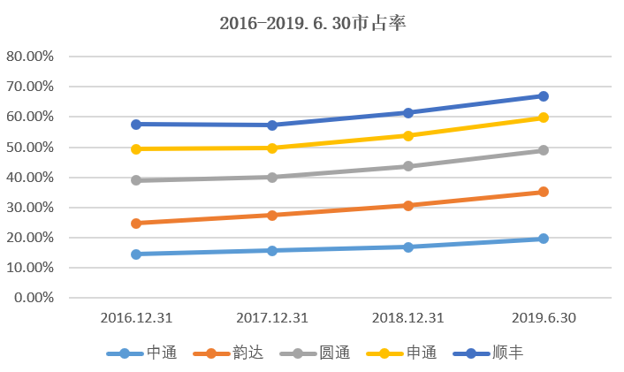 据国家邮政局《2019年9月中国快递发展指数报告》,前三季度累计完成快递业务量440亿件,同比增长26.7%;累计完成快递业务收入5285.5亿元,同比增长24.5%。头部快递公司由于具备成本及服务优势,1-9月份快递品牌集中度指数CR8为81.7,比上年同期提高了0.3,集中度进一步上升。截至2019年6月30日,仅韵达、圆通、申通、顺丰四家的市占率就已占据快递行业市场份额的47.43%,接近一半。如果将在美国上市的中通也涵盖进去,顺丰和通达系占据了快递行业67%的市场份额。