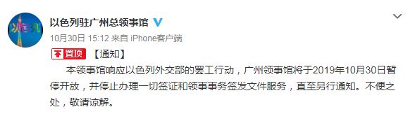 “本领事馆响应以色列外交部的罢工行动,广州领事馆将于2019年10月30日暂停开放,并停止办理一切签证和领事事务签发文件服务,直至另行通知。不便之处,敬请谅解。 ”