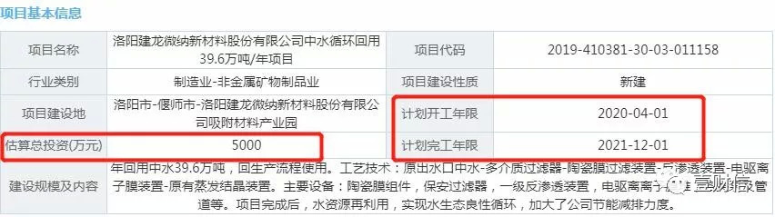 另一个项目"中水循环回用39.6万吨/年项目"招股书披露的总投资为5,086.80万元,建设期为12个月。而在政府网站的备案信息上显示该项目的估算总投资额为5,000万元,计划开工年限为2020年4月1日,计划完工年限为2021年12月1日,则建设期为20个月,远超出招股书披露的12个月建设期。