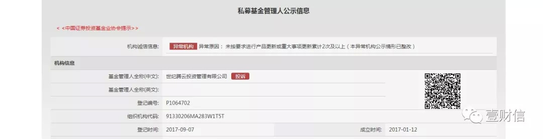 金源紫荆的执行事务管理人为世纪腾云投资管理有限公司(下称:腾云投资),但是,腾云投资竟然被中国证券投资基金业协会(下称:中基协)列入"异常机构"名单。