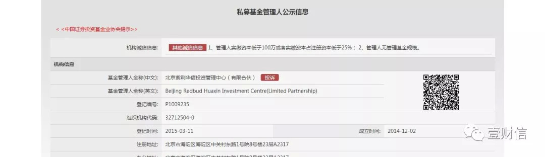 中基协官网显示,紫荆嘉义的执行事务合伙人北京紫荆华信投资管理中心(有限合伙)因存在实缴资本低于100万或者实缴资本占注册资本低于25%、管理人无管理基金规模而存在机构诚信信息异常状况。