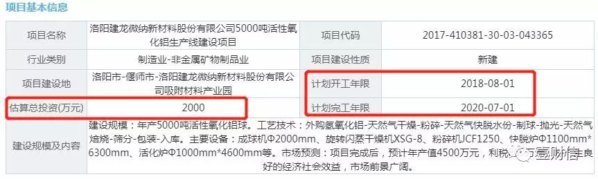 还有一个募投项目"5000吨活性氧化铝生产线建设项目"招股书披露的总投资额为1,832.87万元,建设期为7个月。同样在政府网站的备案信息上显示该项目的估算总投资为2,000万元,计划开工年限为2018年8月1日,计划完工年限为2020年7月1日,建设期长达23个月,招股书竟"缩水"了16个月。