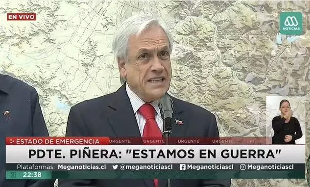 19日,智利总统皮涅拉宣布圣地亚哥进入紧急状态;22日晚,他发表电视讲话向全国人民道歉。