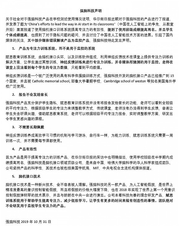 随着此事引发外界关注,界面新闻获悉,2019年10月31日,头环的技术提供方强脑科技发布关于社会对于强脑科技产品在学校测试使用情况说明称,“赋思头环是一款用神经反馈训练的原理,训练学生提升专注力的仪器,并非用来监控学生的产品。”