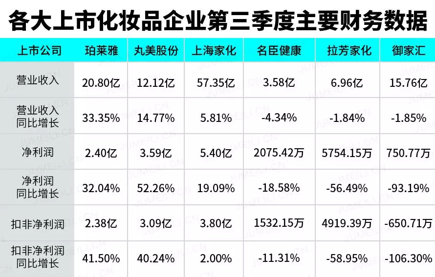 珀莱雅前三季度营收20.8亿,同比增长33.3%,净利润2.4亿,同比增加32.4%,扣非净利润2.38亿,同比增长达到了惊人的41.5%,营收、净利润都超过30%,另外丸美的成绩也不容小觑,前三个季度营收12.12亿,营收收入增长14.44%,净利润增长一倍左右,达到了5.4亿。
