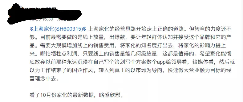 面对这一成绩,有股民表示:“上海家化的经营思路开始走上正确的道路。但转弯的力度还不够。目前最需要做的是线上放量,出爆款,要让年轻群体认知并接受这个品牌和它的产品。需要大规模增加线上的销售费用,将家化的知名度打出去,将家化的影响力提上来。哪怕牺牲点利润,只要线上的销售量能几何级放量,这都是值得的。希望家化能彻底放弃以前那种永远沉浸在自己写个策划写个方案做个app给领导看,给媒体看,然后就以为工作结束了的国企作风。转入到真正的以市场为导向,快速做大营业额为目标的经营理念中去。”