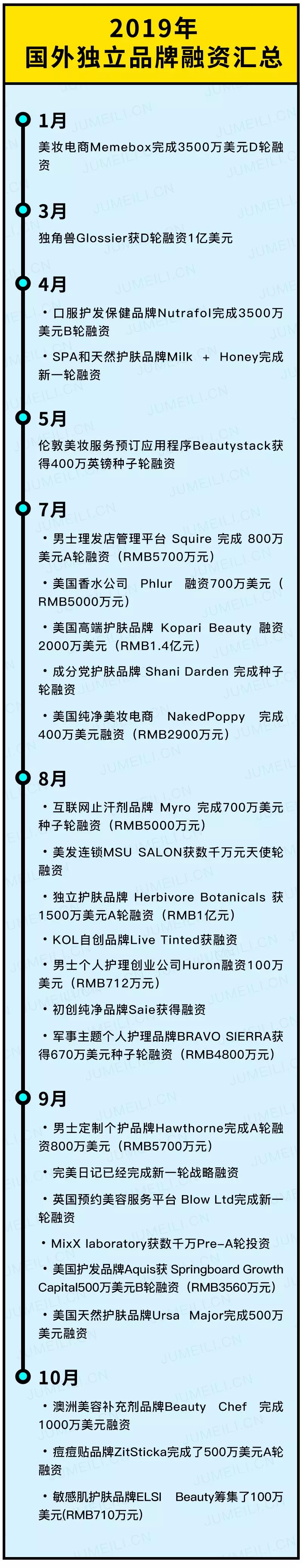 据聚美丽不完全统计,截止到10月底就有26起国外独立品牌融资案例。投资方热烈追求高增长潜力的品牌,希求在完成股权投资后不久,就能以令人咋舌的高价将品牌转手卖给欧莱雅集团、雅诗兰黛集团等战略型美妆行业巨头。