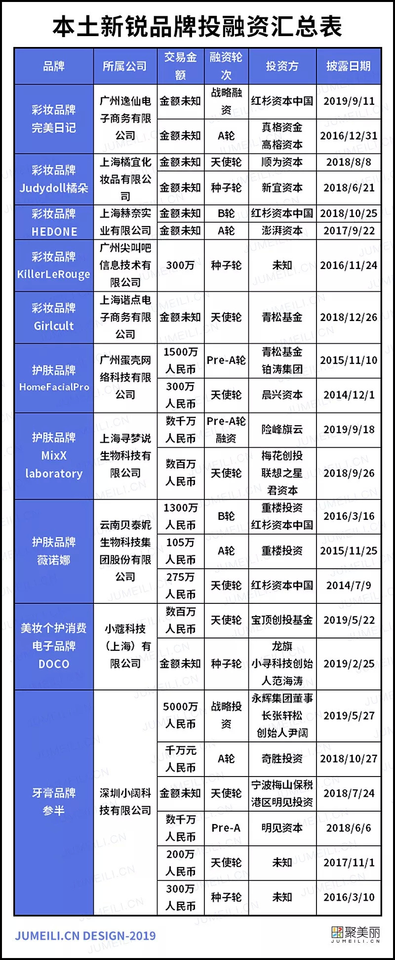 如上图,据聚美丽不完全统计,近年来拿过投融资的国内新锐美妆品牌有10个,其中80%的品牌有拿过不止一次融资。