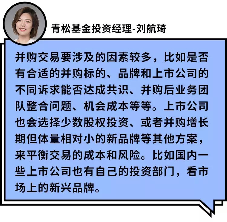 此外,收购成熟品牌所带来的风险或许也是国内收购屡次流产的原因。高浪市场部负责人陈文狮对此表达了自己的看法:“成熟品牌大都已经形成了比较稳定的用户认知和业务模式,这与创始团队息息相关,很难通过资本手段被同化或者改变。并且收购完成后创始团队是否能继续为品牌服务?是否能继续保持原有的热情?是否能接受资本方的管理?收购金额大、管理难度高,这些都是上市公司会顾虑的风险。相对而言,新锐品牌还处于稚嫩的发展阶段,发展潜力更大,也更容易被管理。”