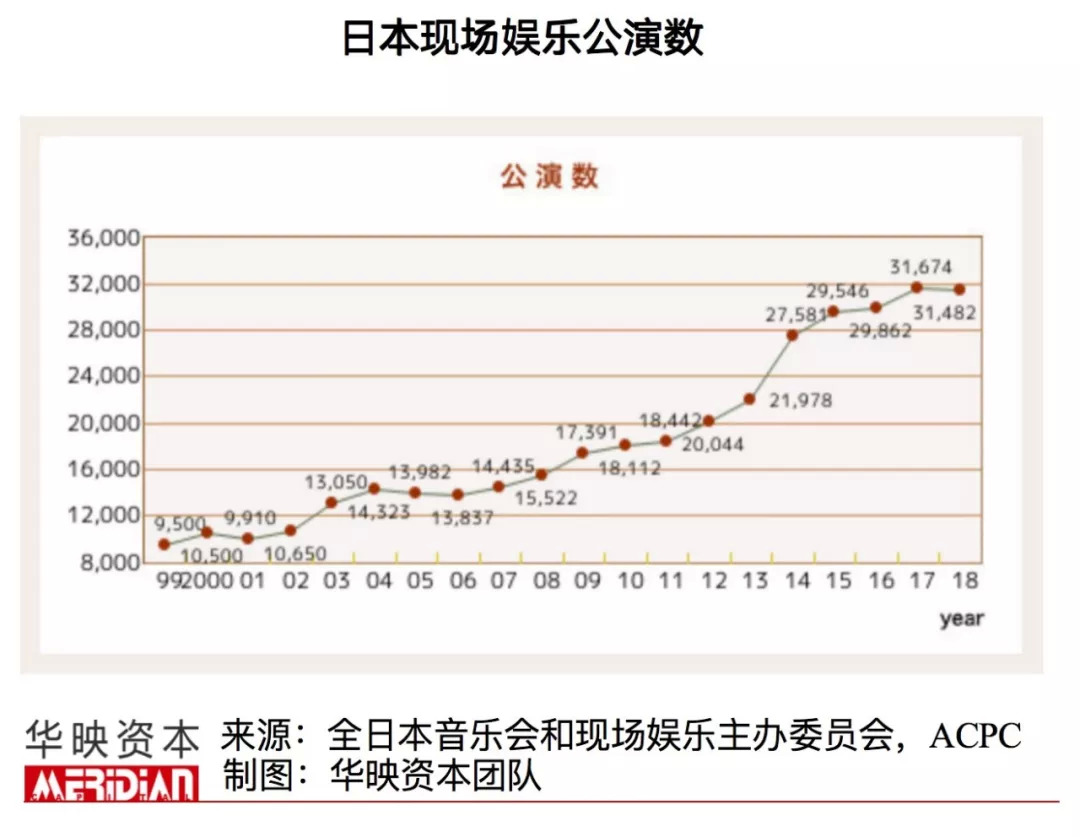 这背后的日本现场娱乐市场如今已成为世界第二大市场(仅次于美国),其在2017年和2018年的演出数量分别达到了31674场和31482场,票房销量分别达到了3320亿日元(约220亿元人民币)和3450亿日元(约229亿元人民币)。