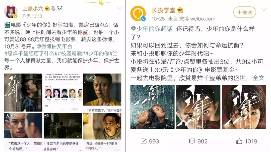 此外,更重要的是,易烊千玺粉丝并不是“圈地自萌”,他们注意到路人的口碑对影片有着极大助力:他们采用了赠票给各领域KOL转发抽奖的方式,利用KOL大号的宣发优势,极大程度地为《少年的你》进行曝光,吸引到一定量的路人前去观影,为路人的自来水营销做了铺垫。