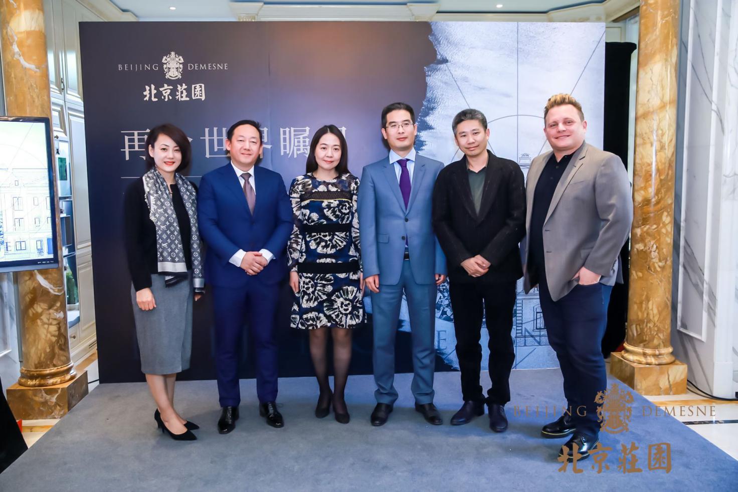 从左至右依次为:和裕地产营销中心副总经理/北京庄园项目负责人-金媛媛女士、和裕地产研发中心总经理-张璐先生、法国Pierre-YvesRochon设计公司副总裁/高级项目总监-陈文津女士、和裕地产总裁-樊明珠先生、北京墨臣建筑设计事务所董事合伙人/总裁/设计总监-赖军先生、lii美国景观设计公司资深董事/设计总监/主创-Andy先生。