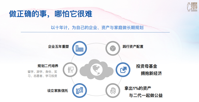 唐宁给出重磅锦囊:以十年计,为自己的企业、资产与家庭做⻓期规划。“围绕企业五年重塑一次,用科学先进的方式规划二代培养,设⽴家族信托,践行资产配置,用投资母基金的方式拥抱新经济,拿出1%的资产与二代⼀起做公益这六大维度,用这套‘六脉神剑’,为未来做好布局。”