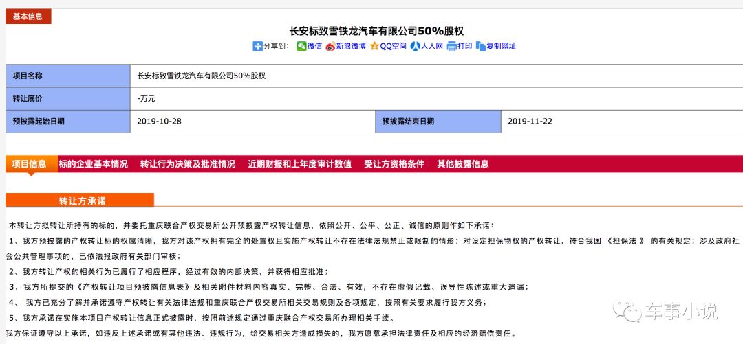 据车事小说从重庆产权交易所了解到,重庆长安汽车股份有限公司在10月28日已经对转让长安标致雪铁龙汽车有限公司50%股权进行了预披露。预披露日期为2019年10月28日起至2019年11月22日止。受让方资格条件以及转让金额等信息并未披露。