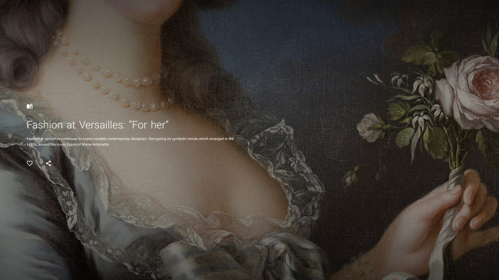 这场在一个月前上线的虚拟展览主题叫做:“凡尔赛:这座宫殿属于你”。内部又包含18场主题展览,陈列超过390件展品;18个3D模型和6场3D play导览;6幅超高分辨率呈现的世界名画和4个沉浸式绘画之旅;以及4个360度全景之旅。你可以一次又一次放大观赏玛丽·安托瓦内特皇后的肖像,也可以在虚拟宫殿中游走于连通各个房间的观景长廊。