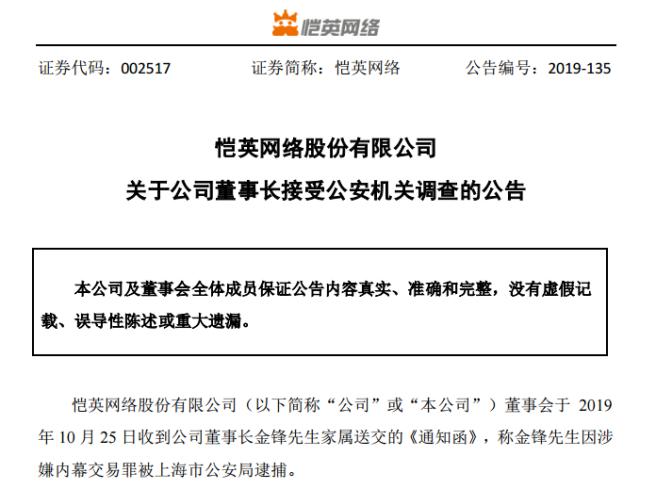 然而10月25日恺英网络发布的金锋涉嫌内幕交易罪被上海市公安局逮捕的公告似乎有些打脸。