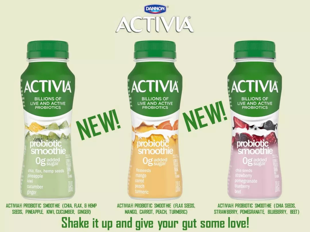 达能旗下酸奶品牌Activia新推的益生菌Smoothies系列产品于7月首次亮相,将水果、蔬菜、种子与活性益生菌组合,打造出摇着喝的零糖低脂酸奶饮品,为消费者带来全新的酸奶体验。该系列共有3种口味选择:绿色装的奇亚籽、亚麻籽、大麻籽、菠萝、猕猴桃、黄瓜、姜;黄色装的奇亚籽、芒果、萝卜、桃子、姜黄;红色装的奇亚籽、草莓、石榴、蓝莓、甜菜等。