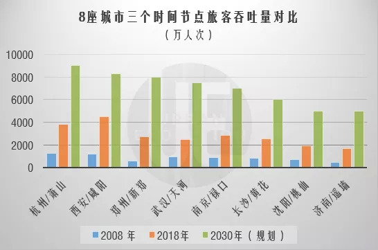 城叔通过公开信息梳理发现,近期有所动作的杭州、西安、郑州、武汉、南京、长沙、沈阳及济南等8座主要城市,为2030年定下的旅客吞吐量目标,均为2018年2 ~3倍左右。